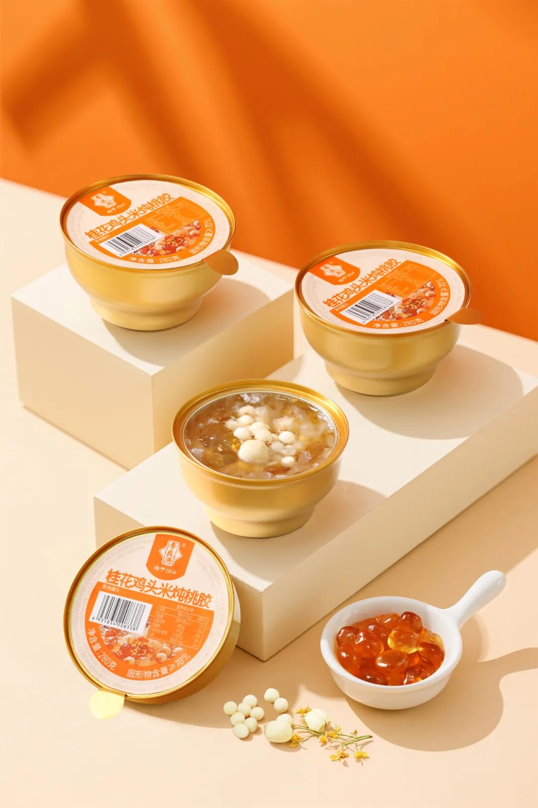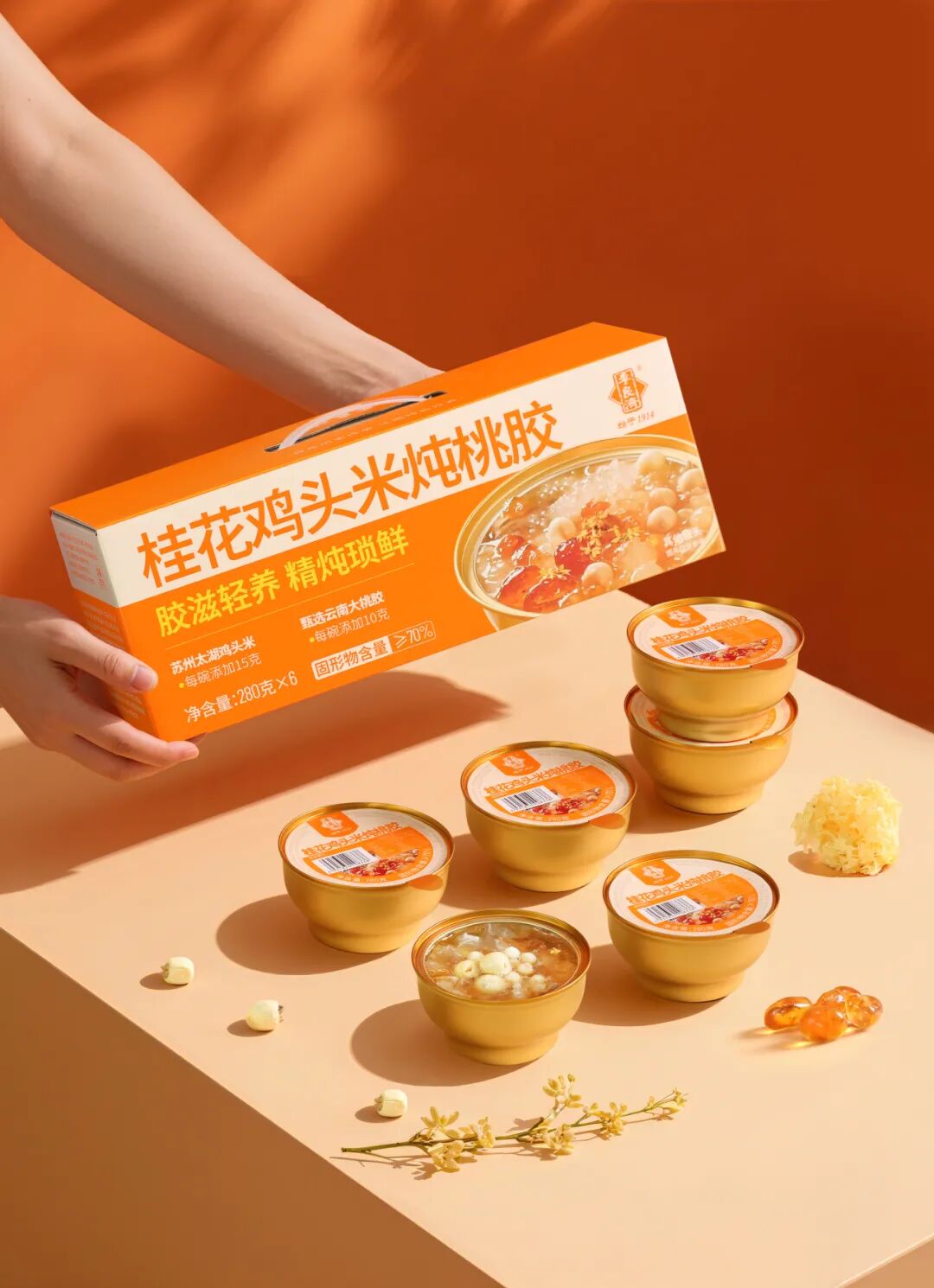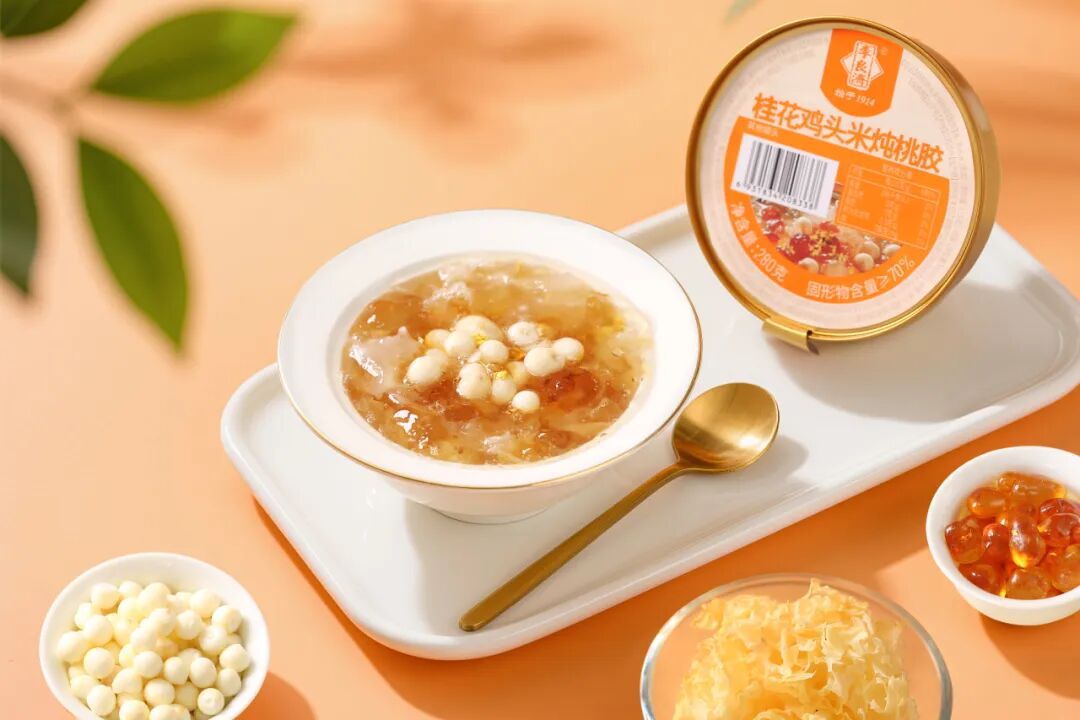 桂花雞頭米燉桃膠,每碗添加15克雞頭米、10克大顆粒桃膠,固形物含量≥70%,滿滿膠質,口感醇厚,讓你由內而外散發美麗。而且還適合全家一起以膠養“嬌”,共享健康美味。