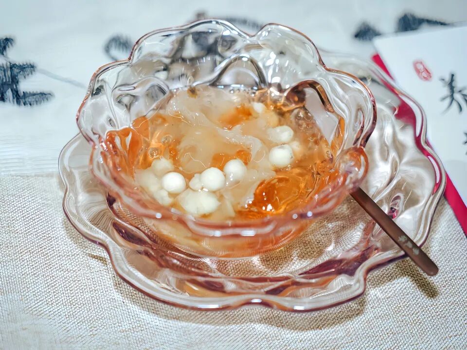 這樣一碗桂花雞頭米燉桃膠,雞頭米軟軟糯糯、銀耳膠質滿滿入口順滑,桃膠QQ彈彈,蓮子粉粉糯糯,多重滋味,完美融合,絲絲甜潤,深入湯羹,美味在舌尖甘醇綻放~